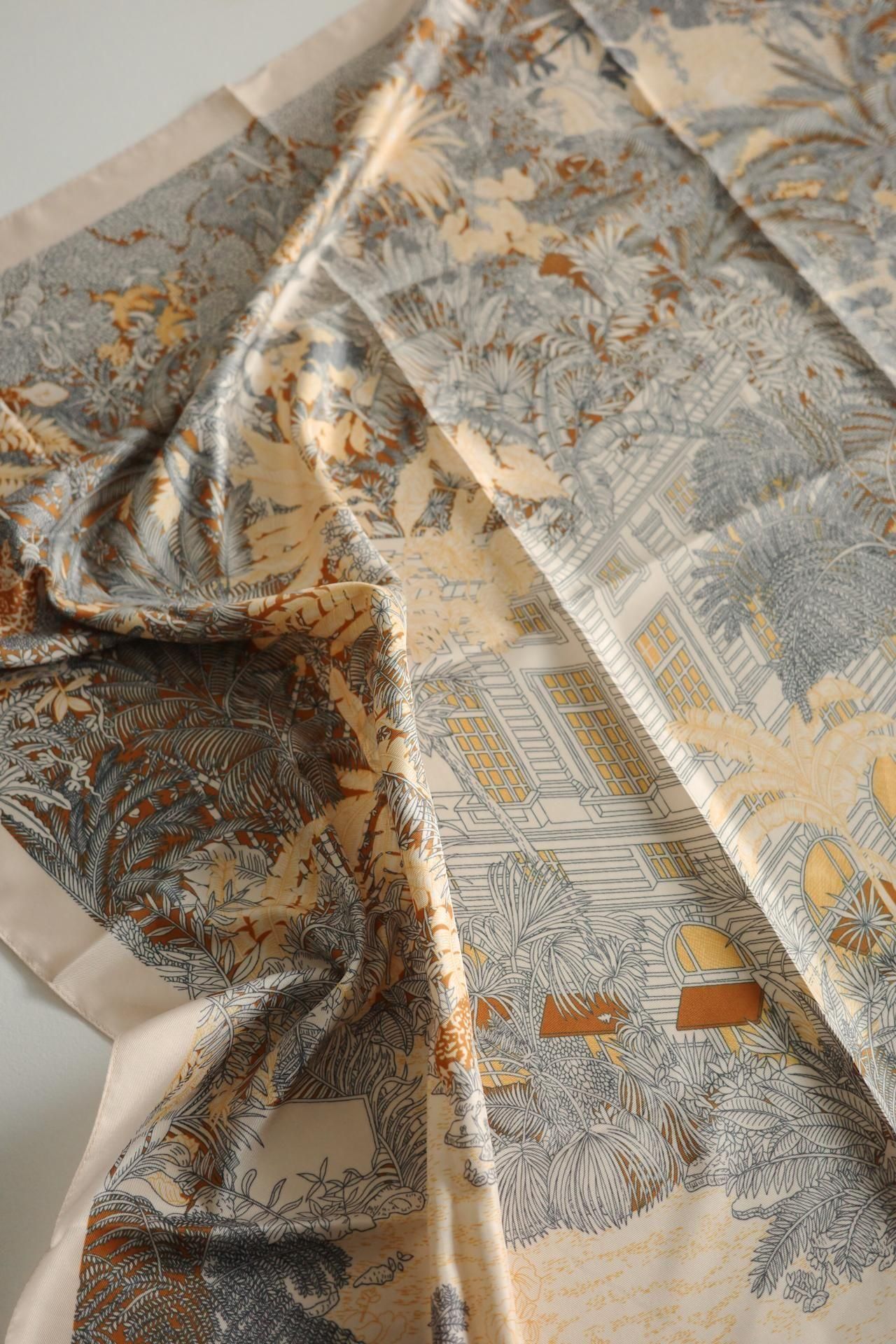 取り入れるだけで旬のコーデに仕上がる大判のプリントスカーフ