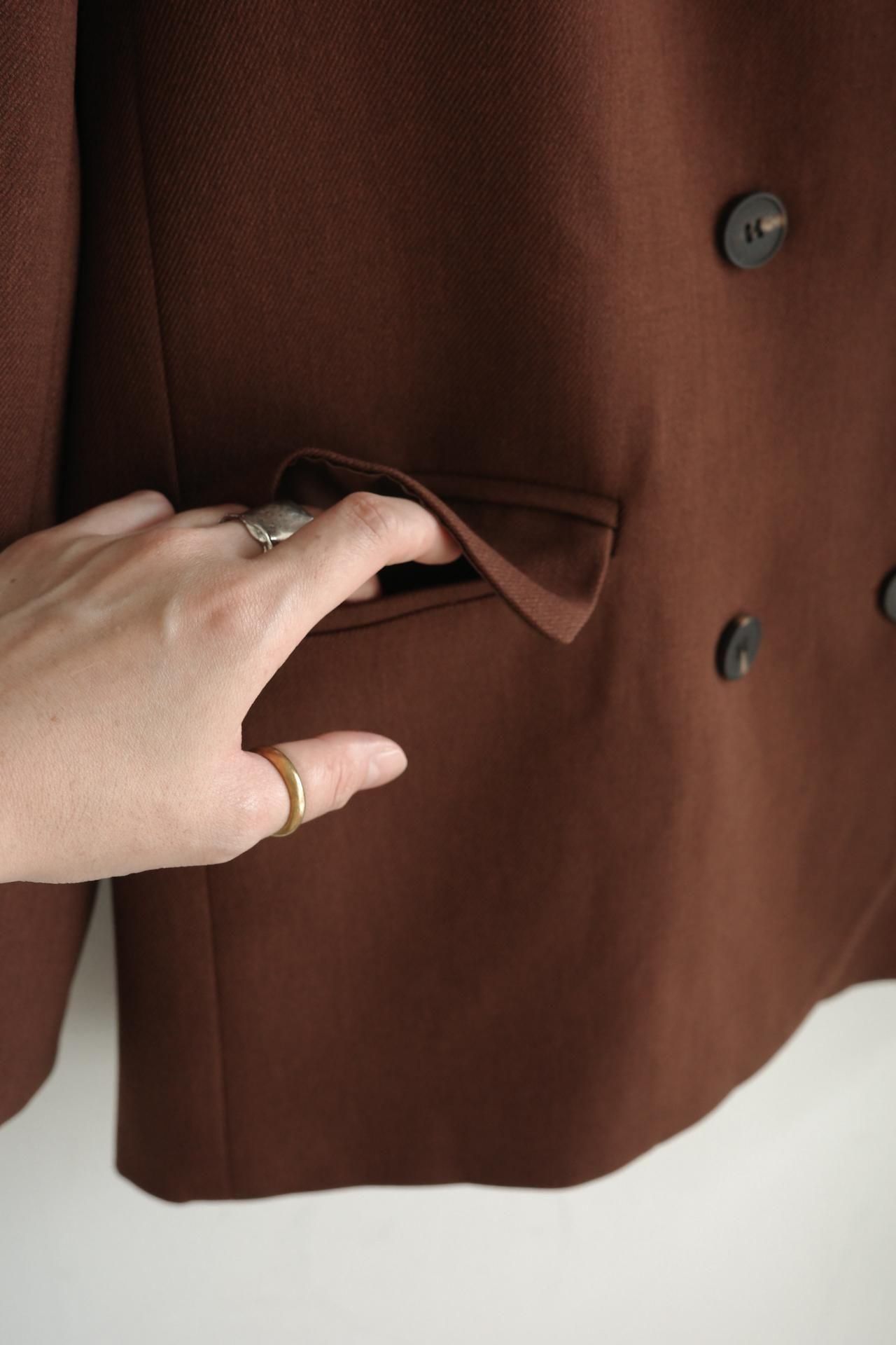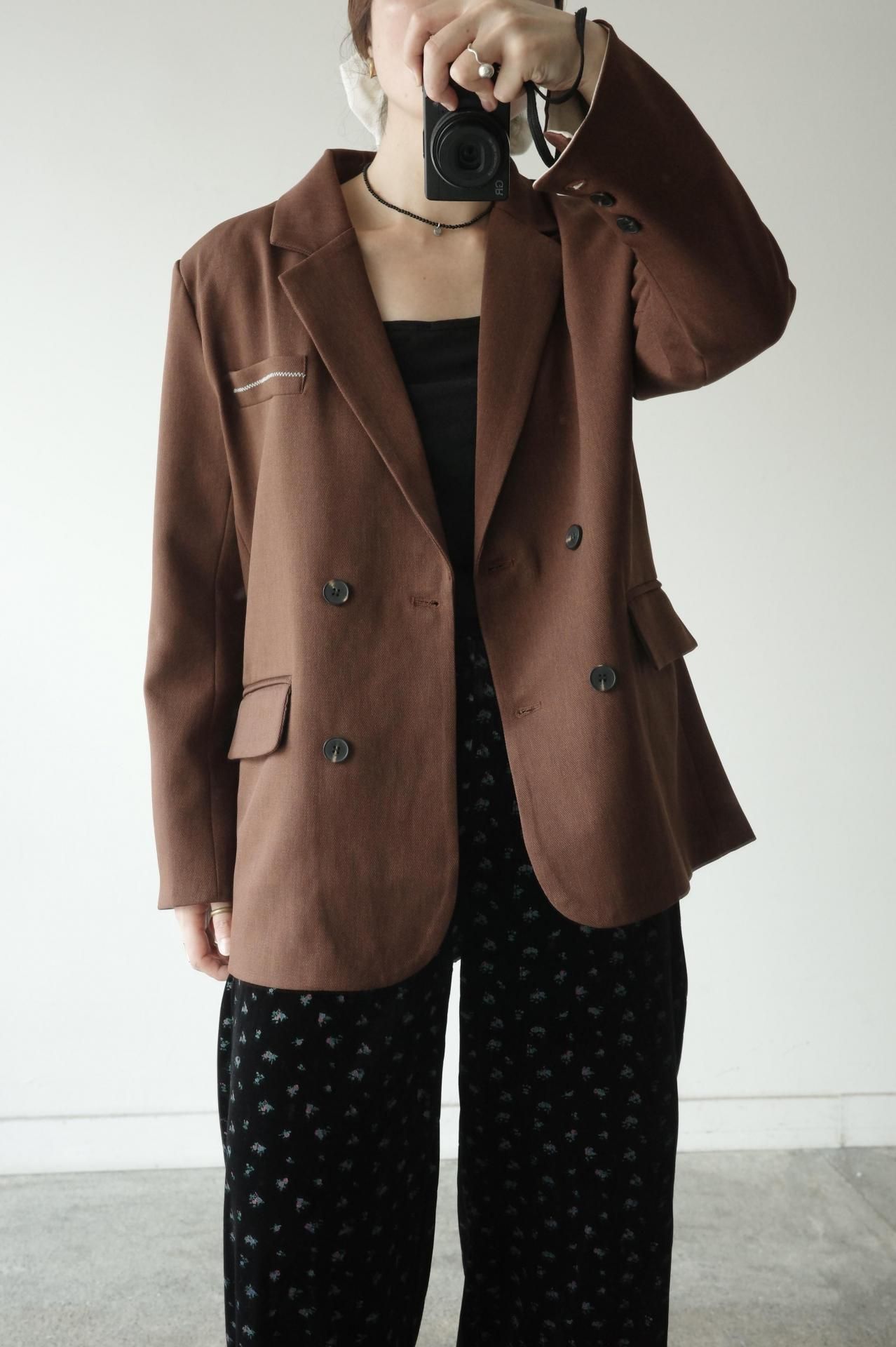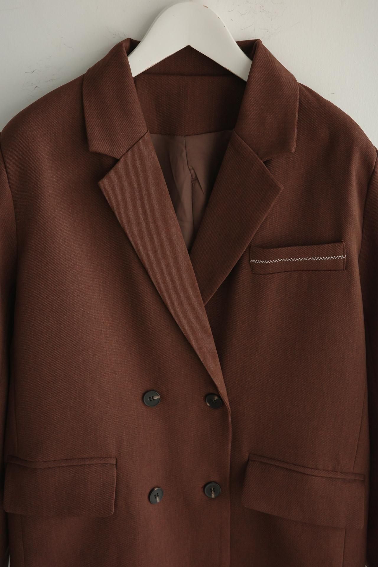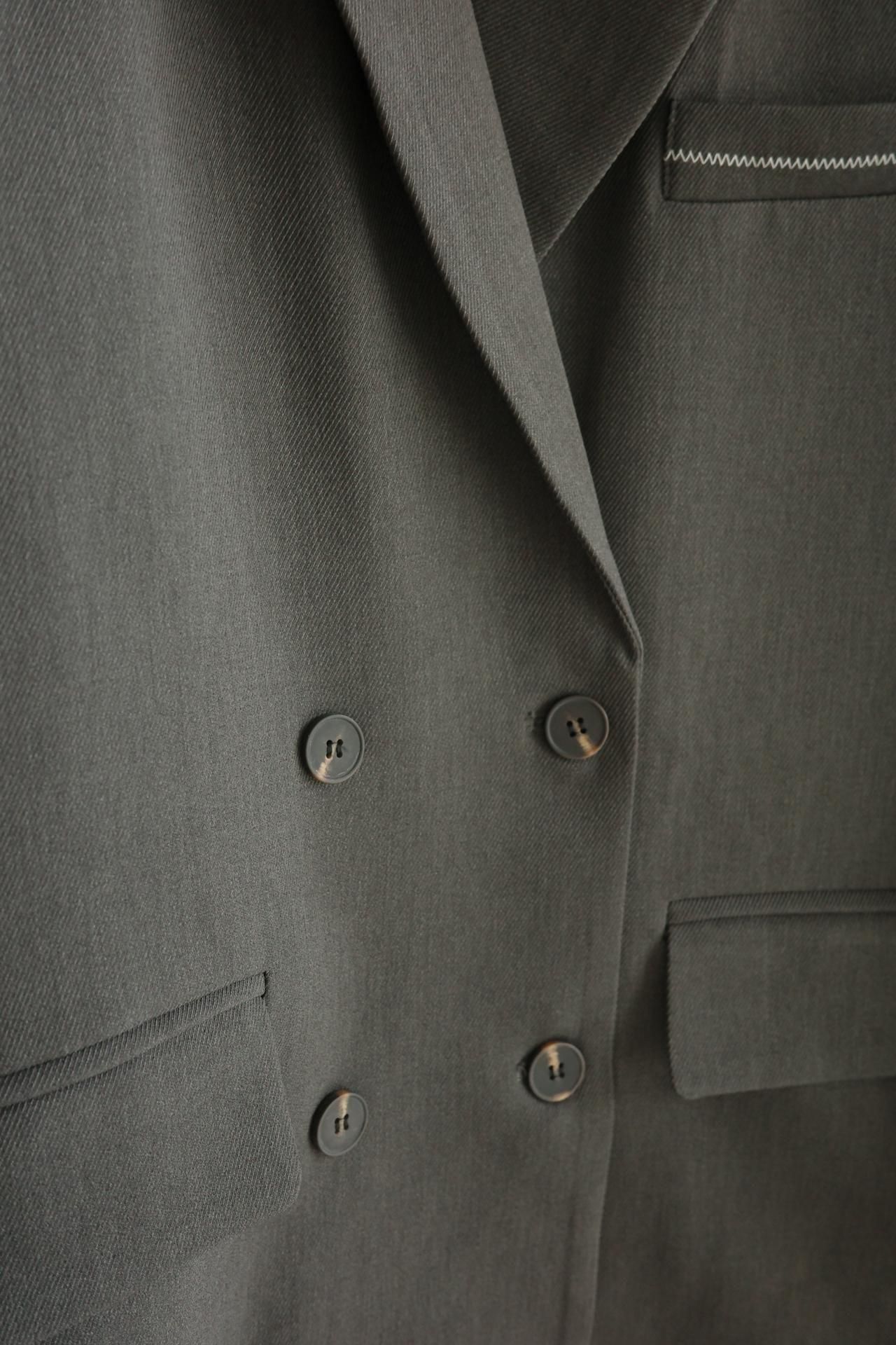 ダブルボタンデザインと胸ポケットのステッチがポイント