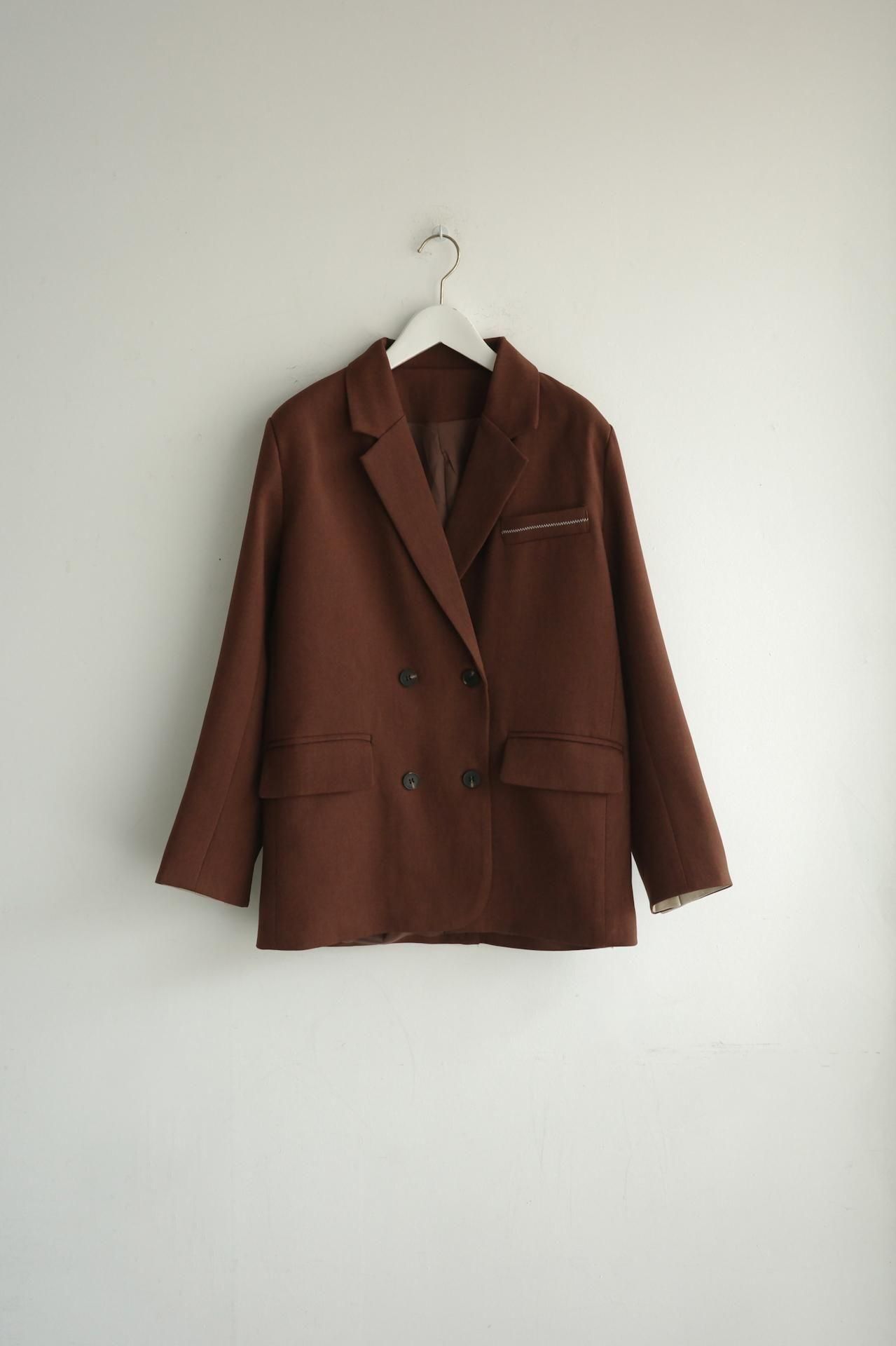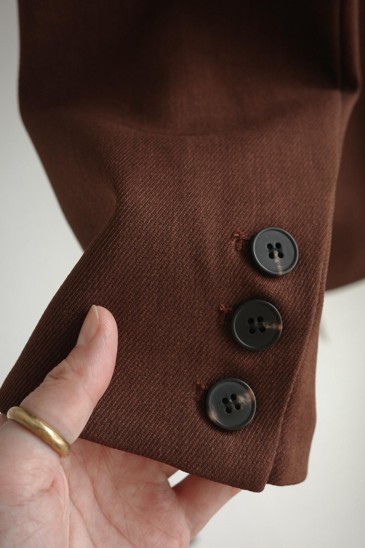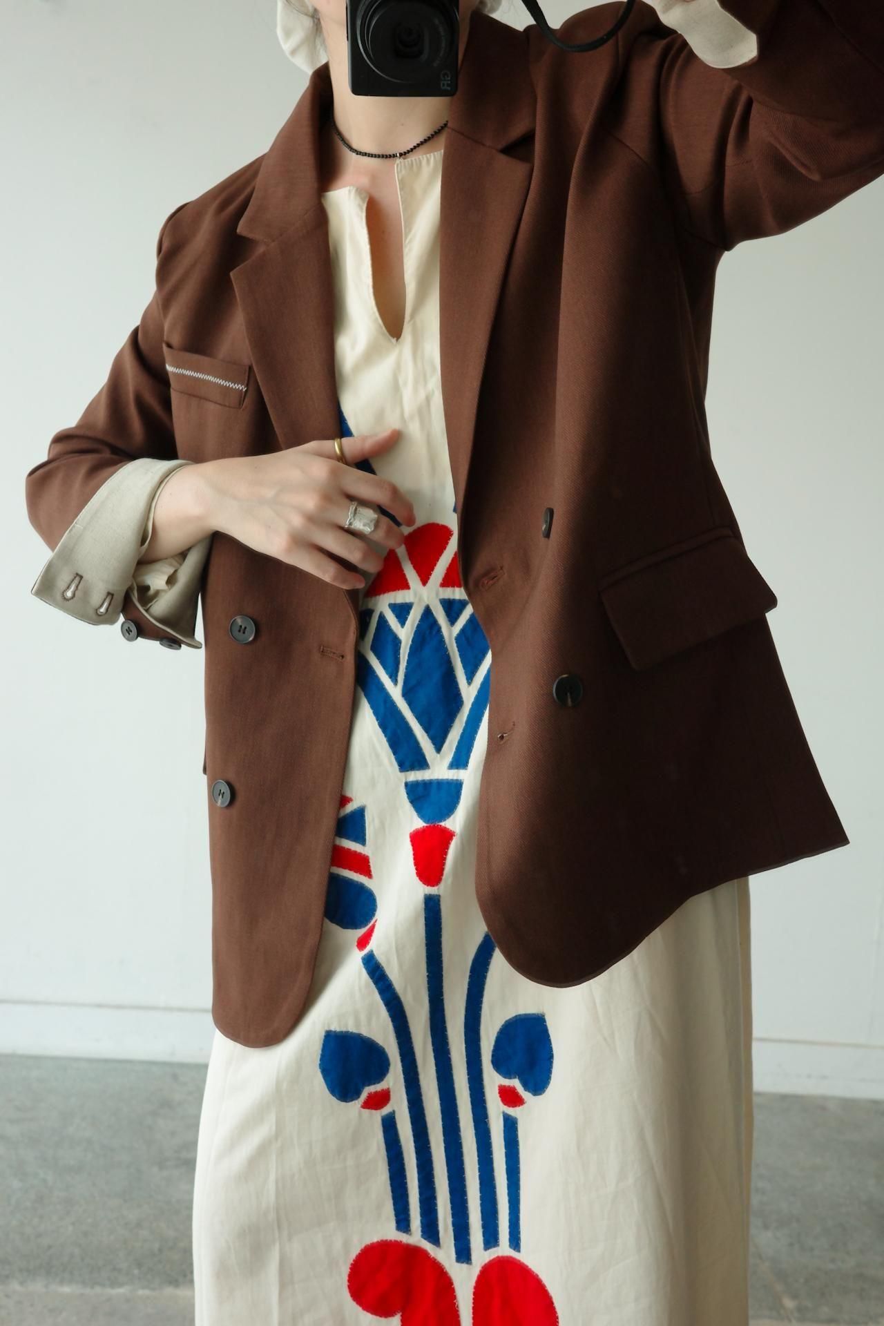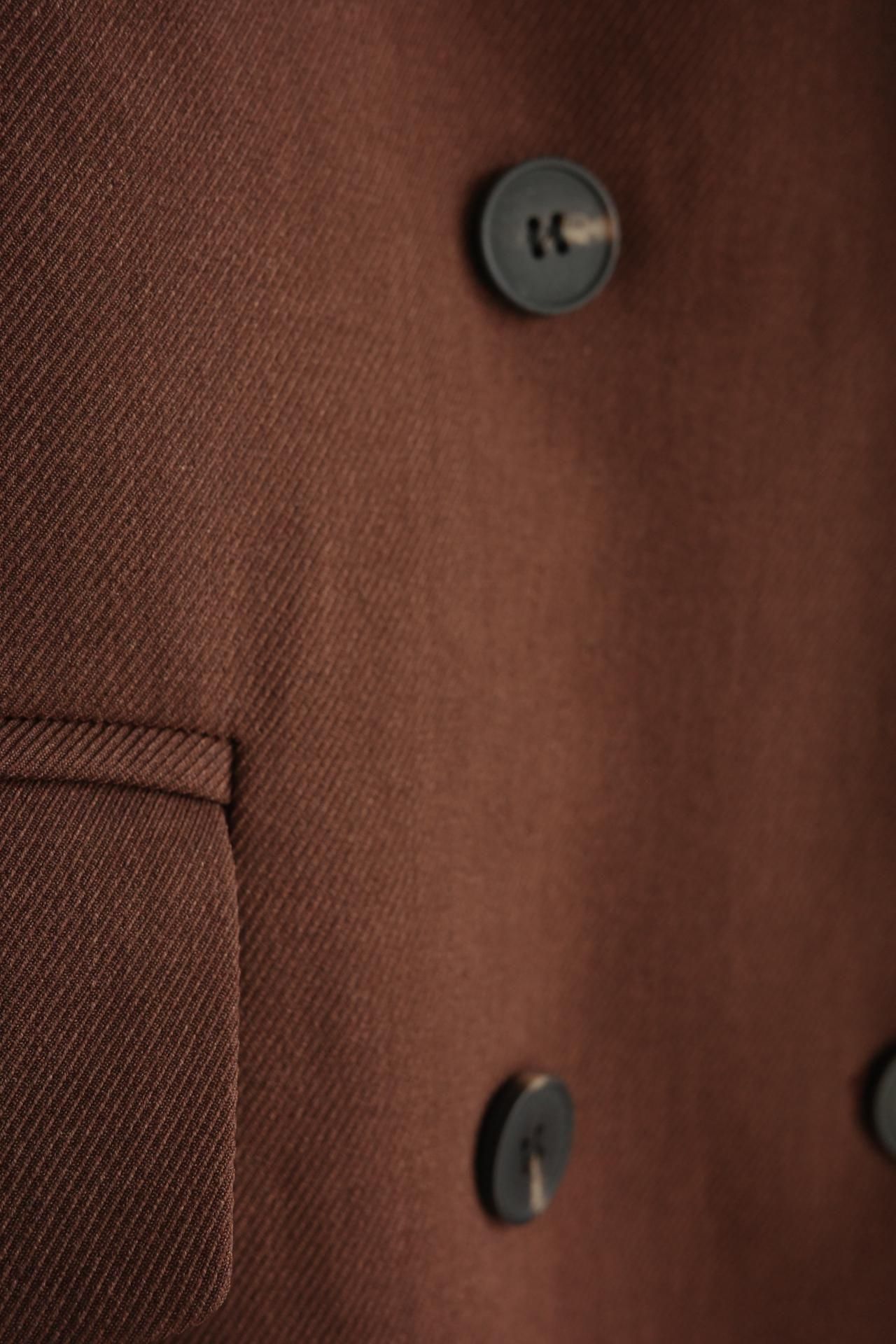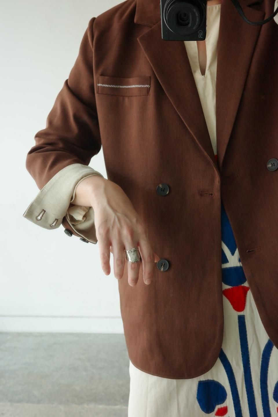 ダブルボタンデザインと胸ポケットのステッチがポイント