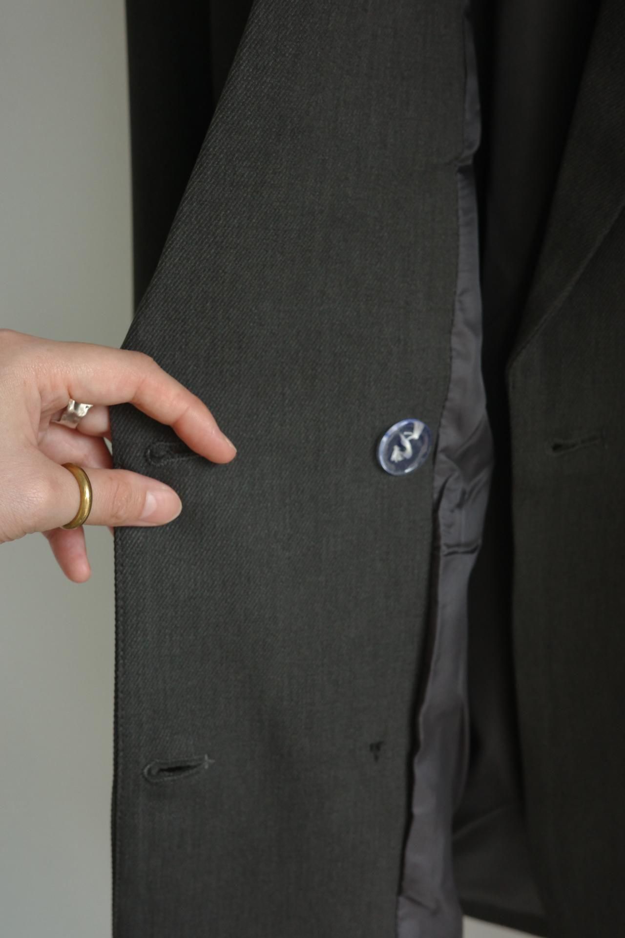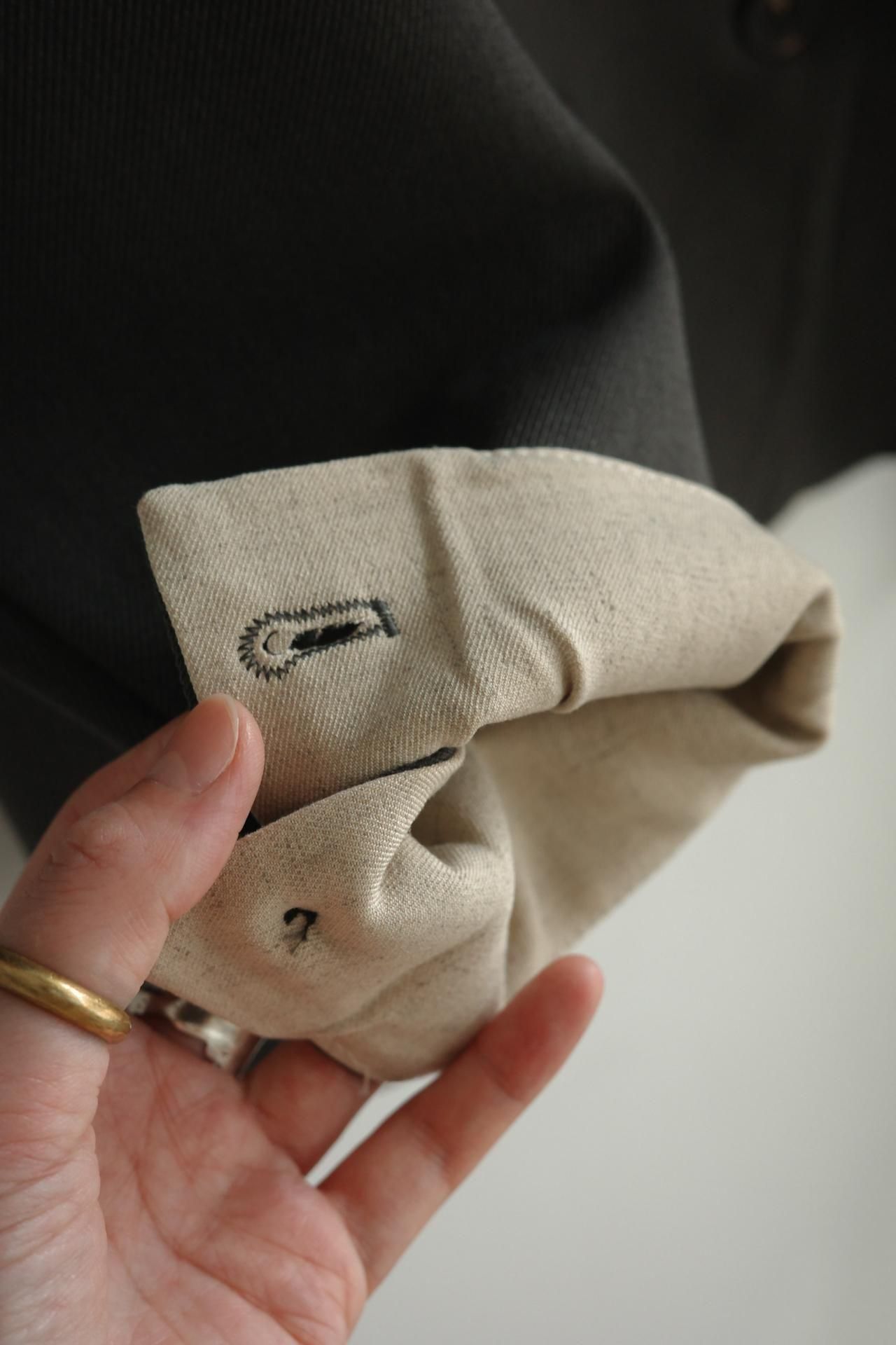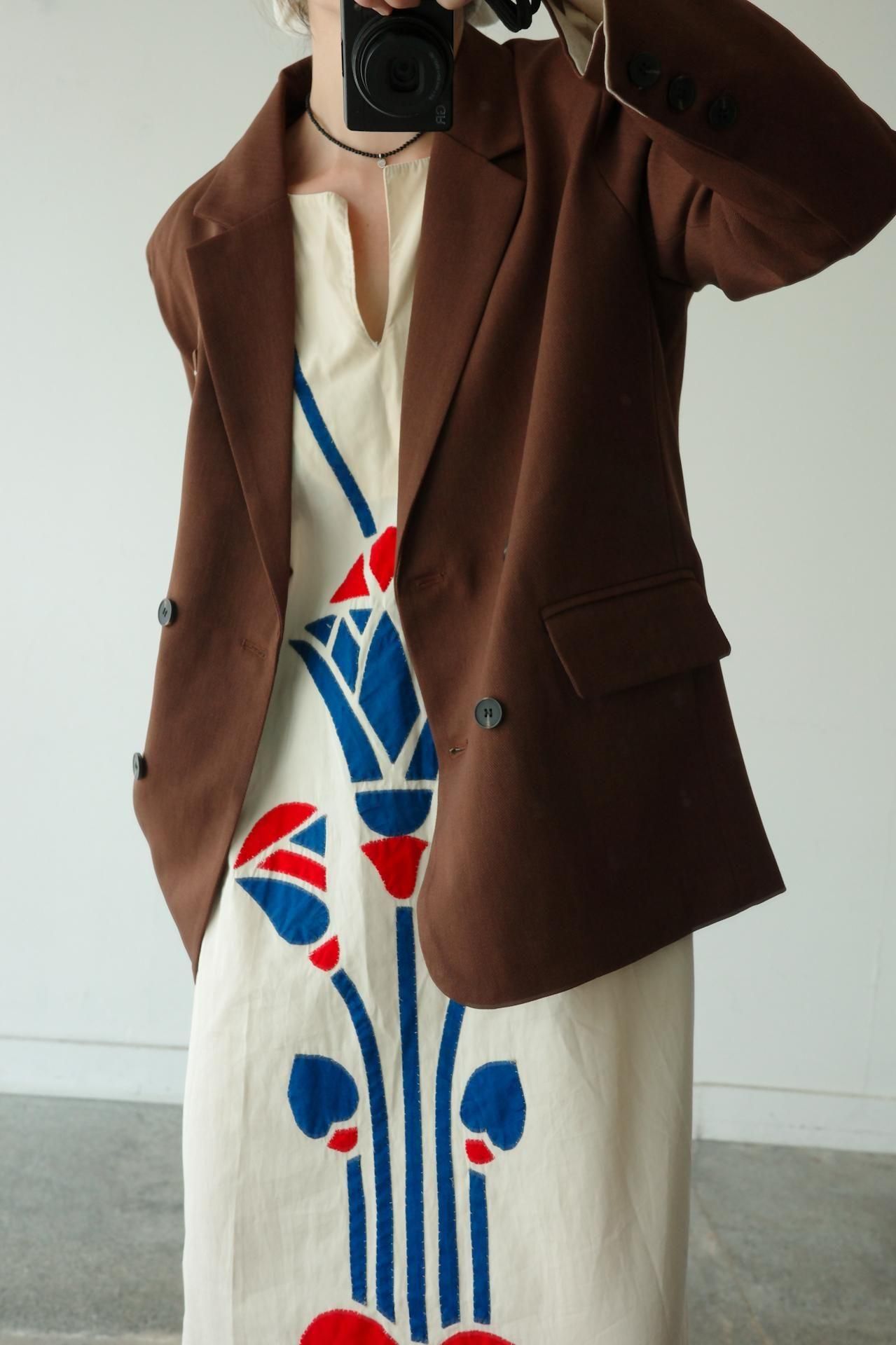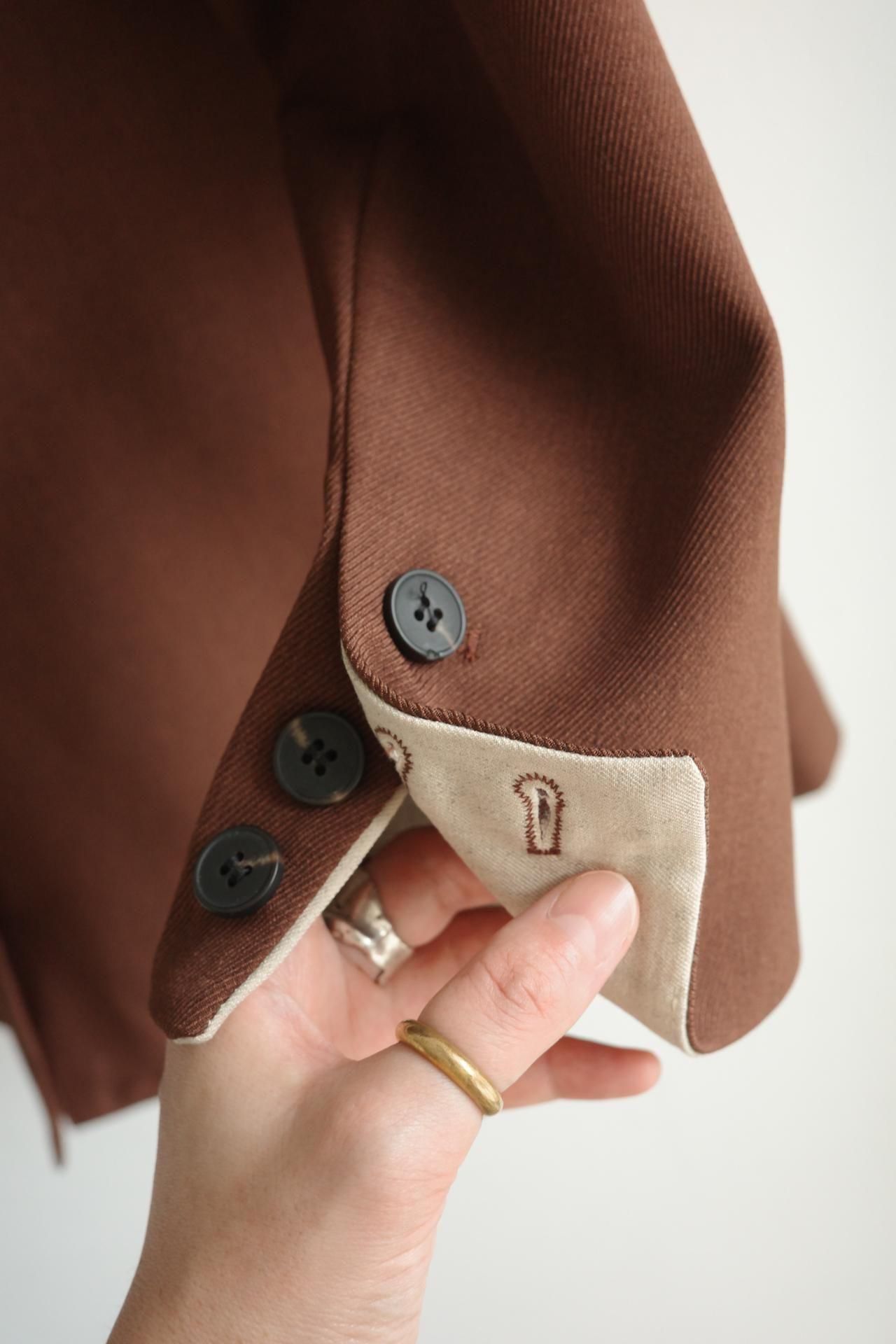 ダブルボタンデザインと胸ポケットのステッチがポイント