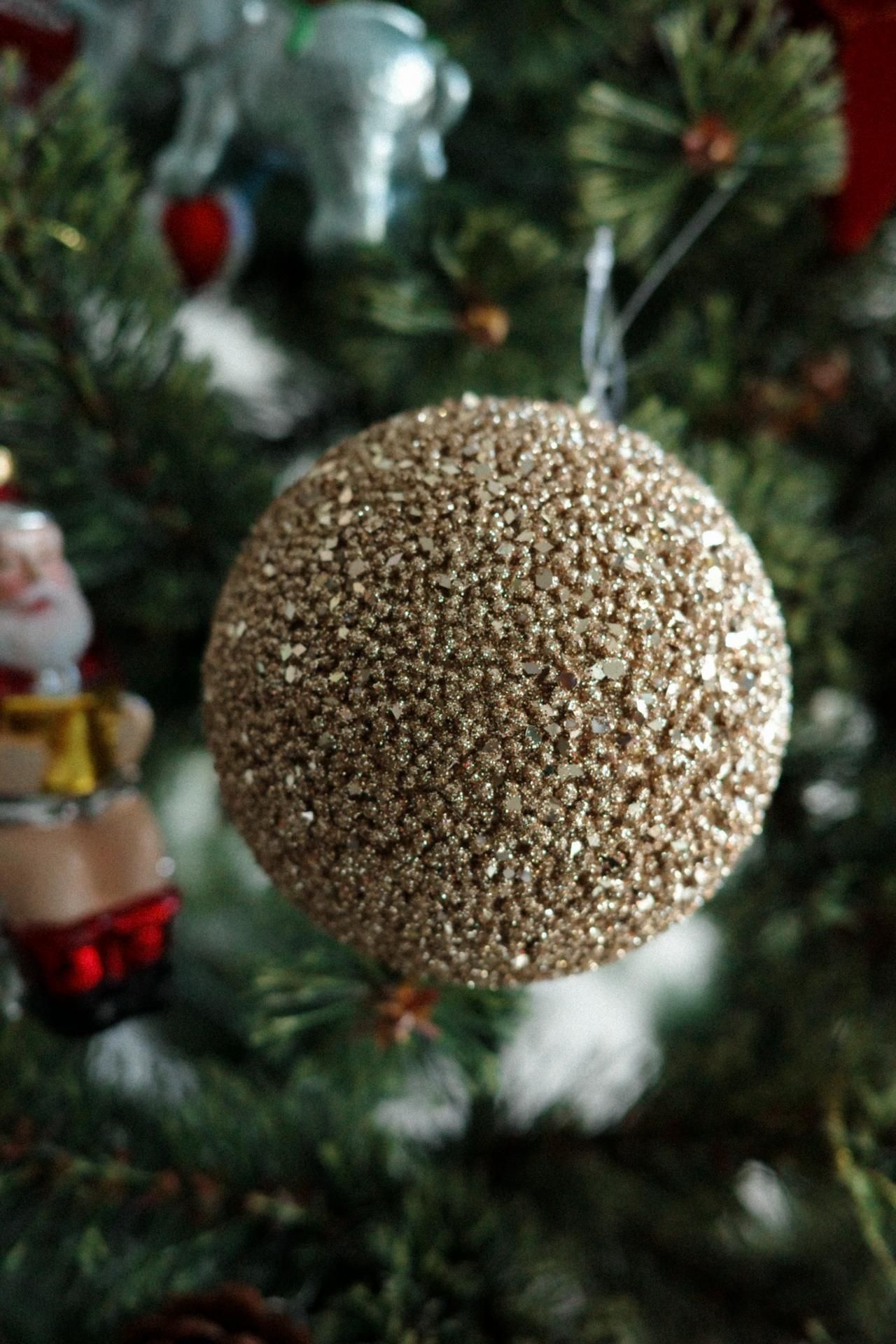 小さなキラキラの粒が輝くゴールドのボールオーナメント