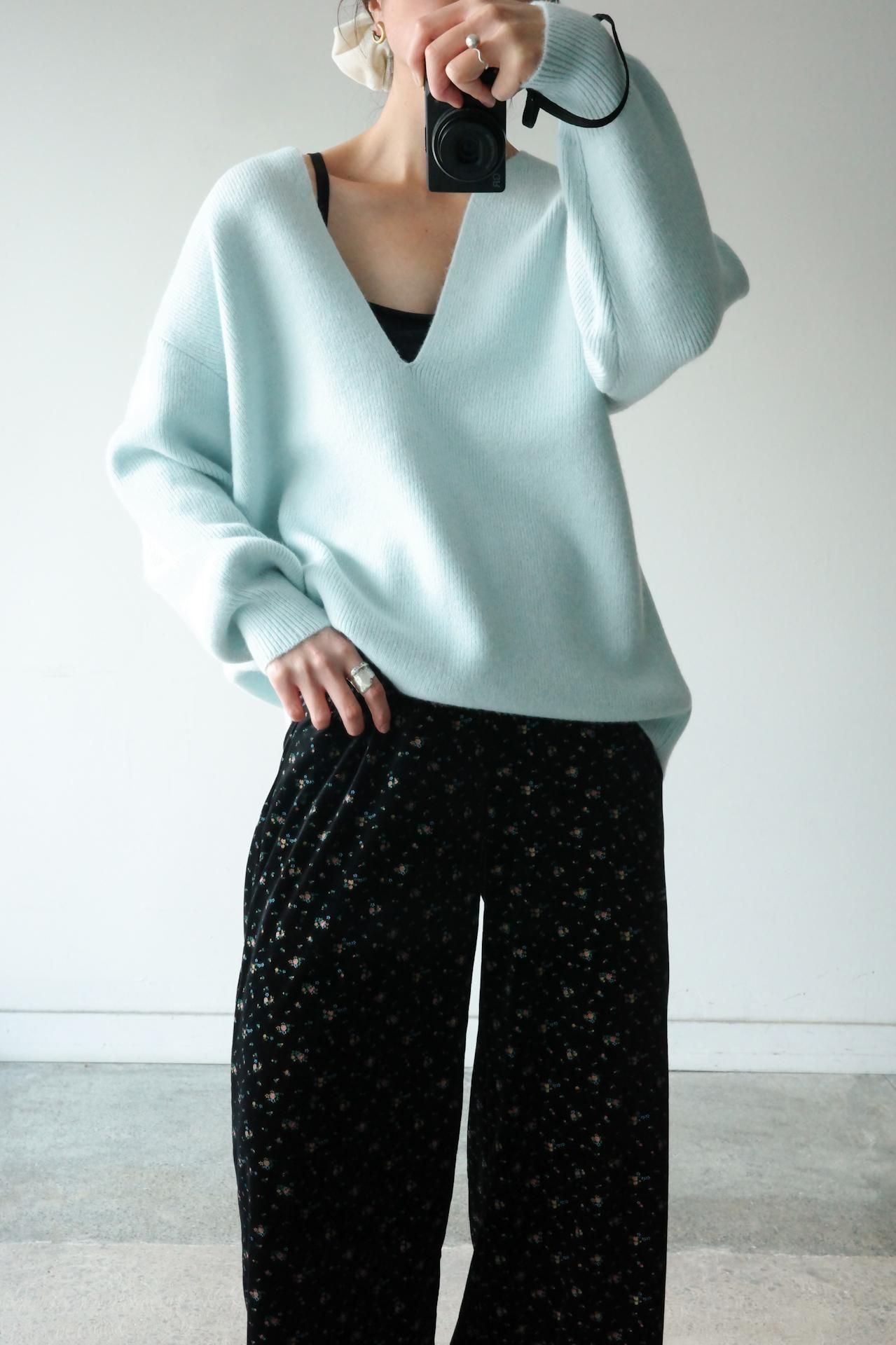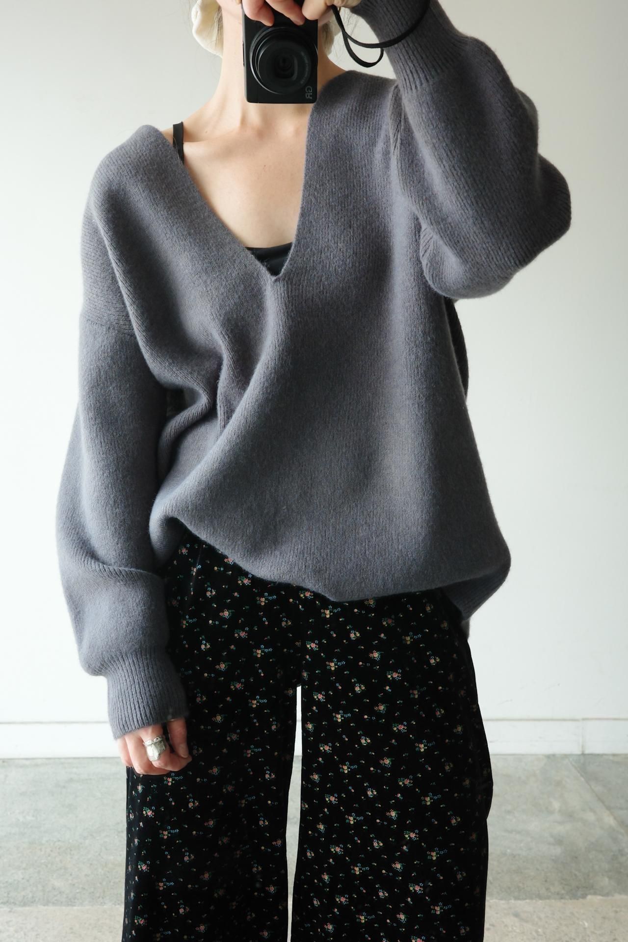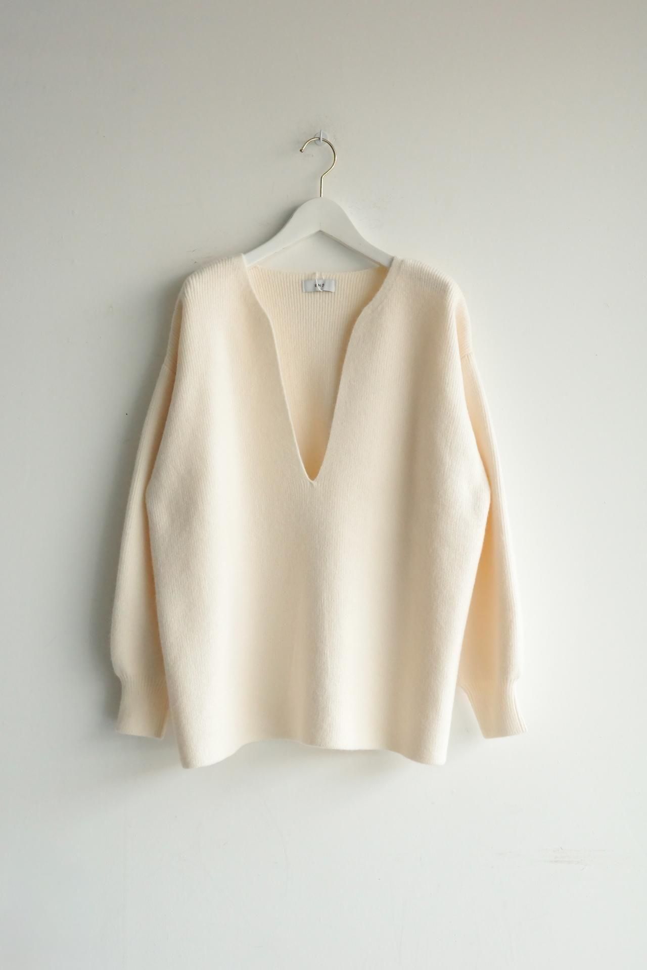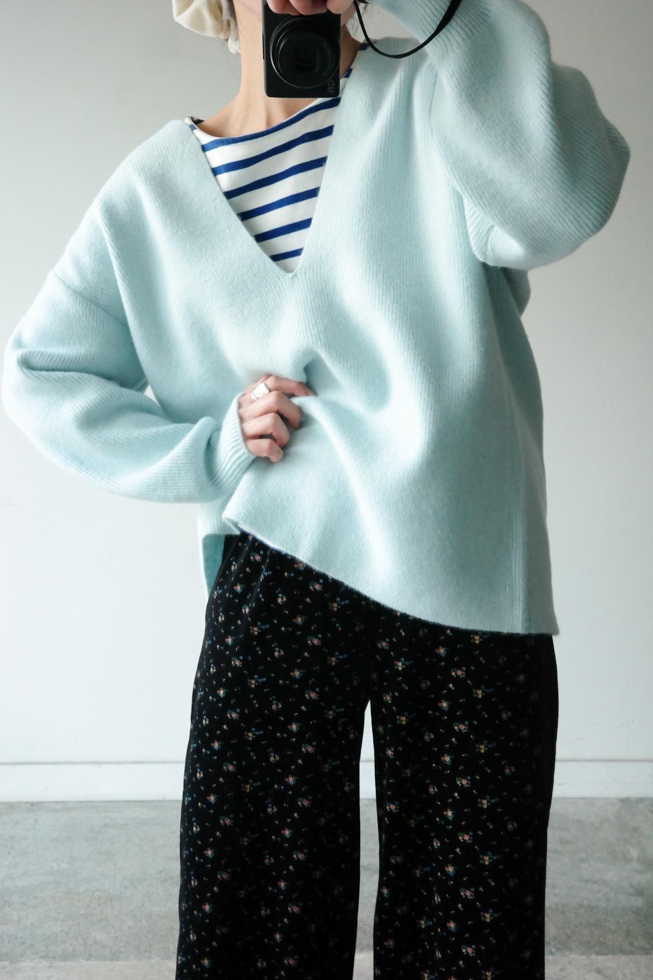 深めのVネックが顔まわりをすっきりと見せるデザインで