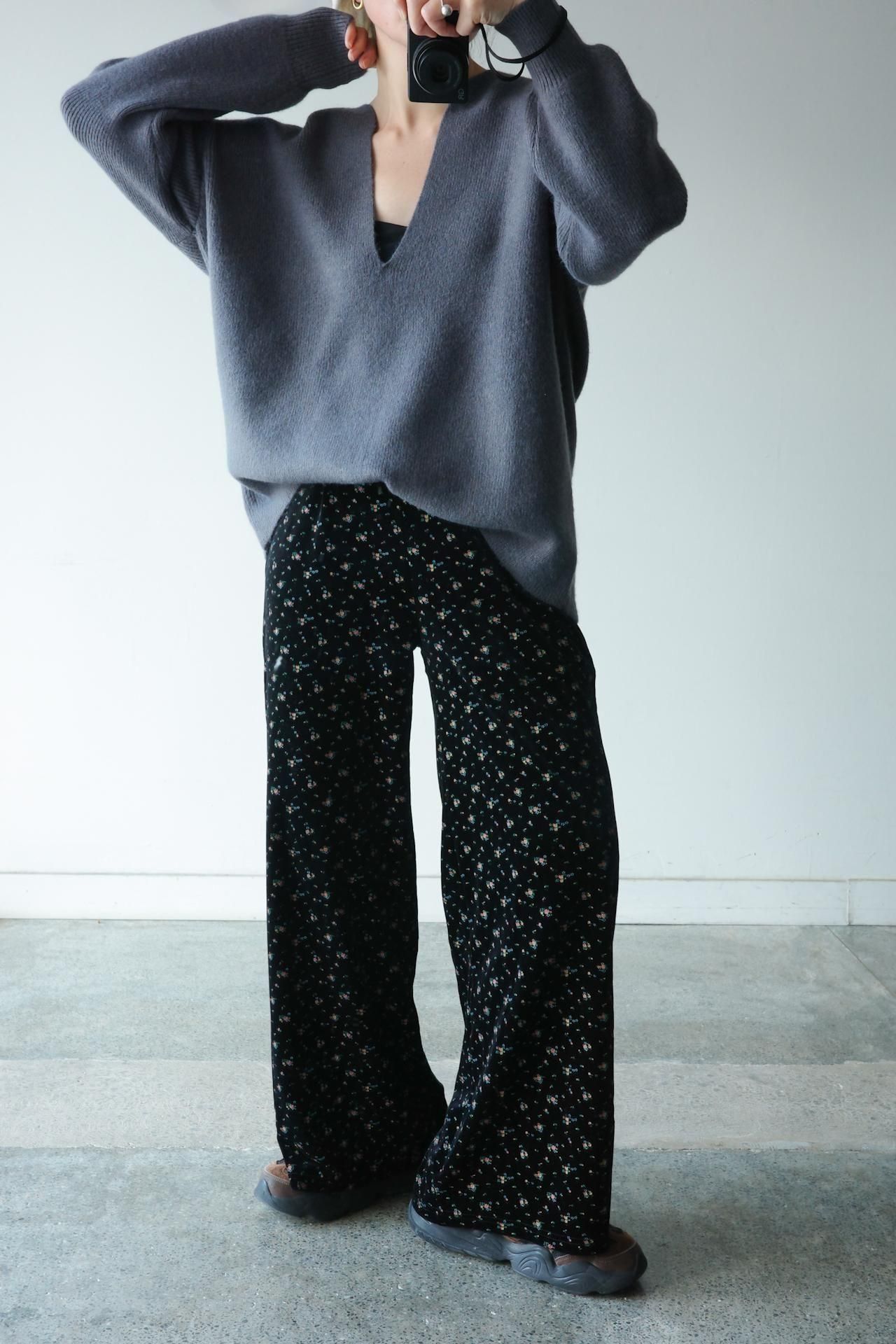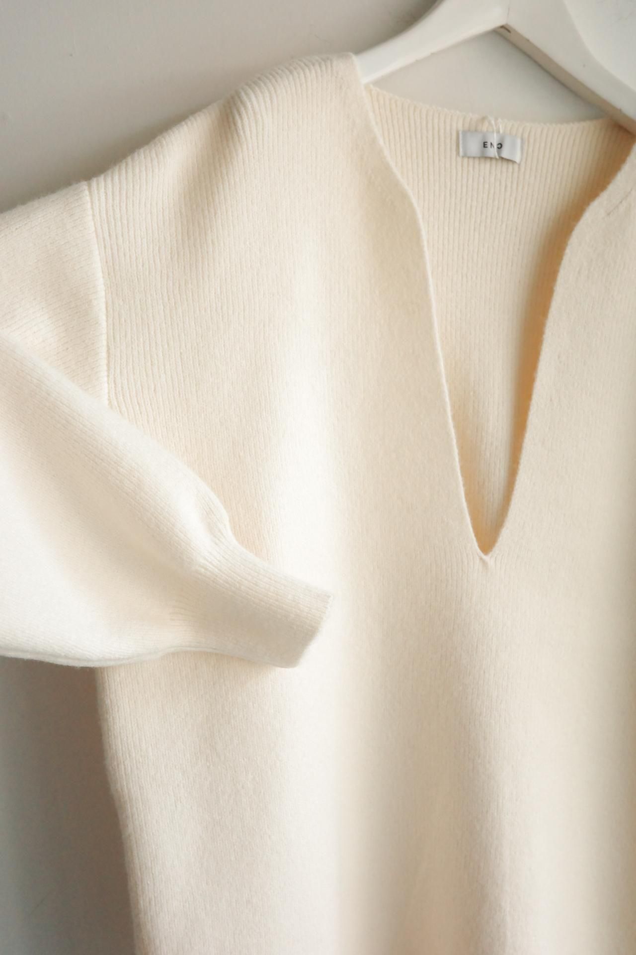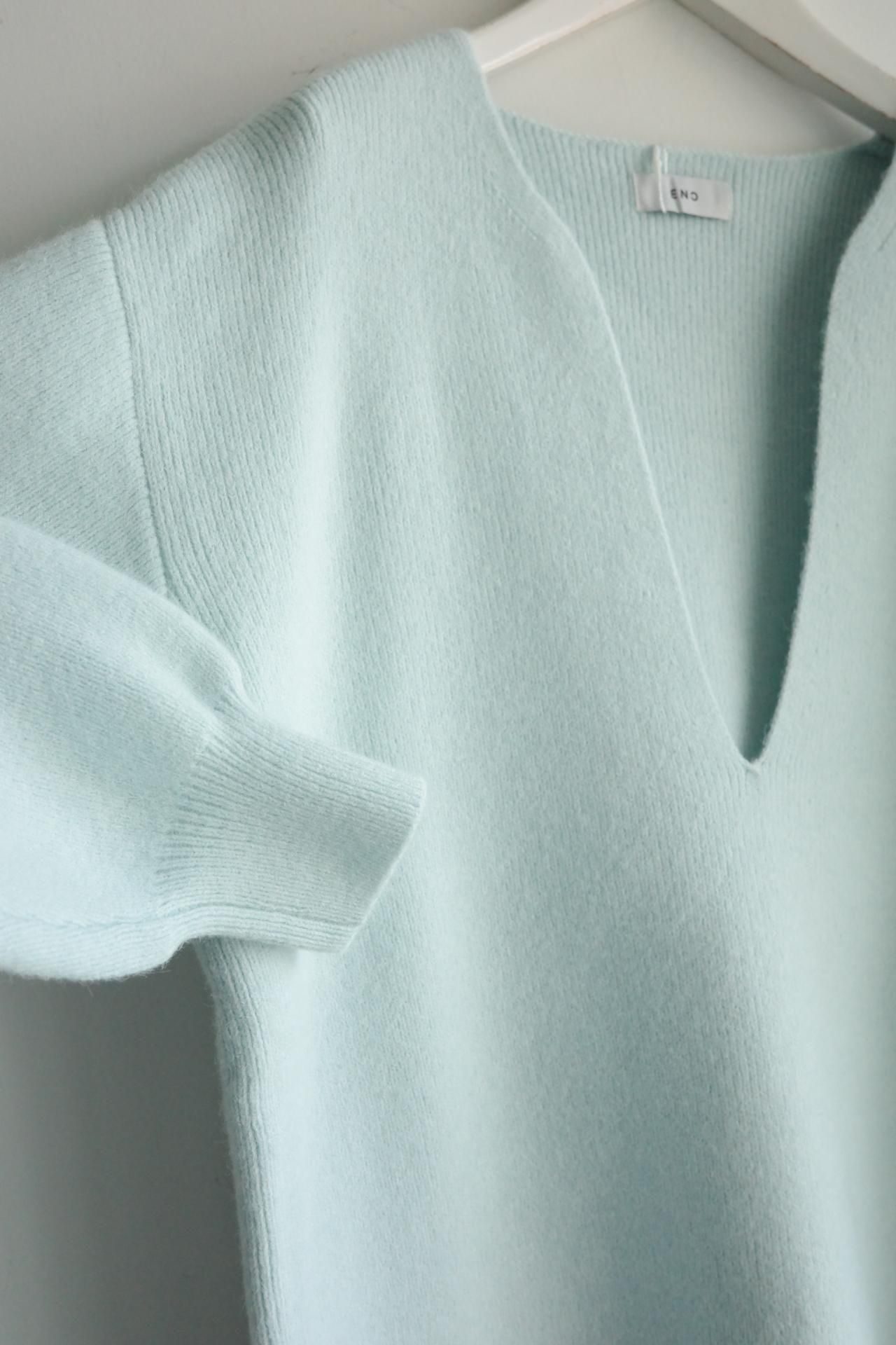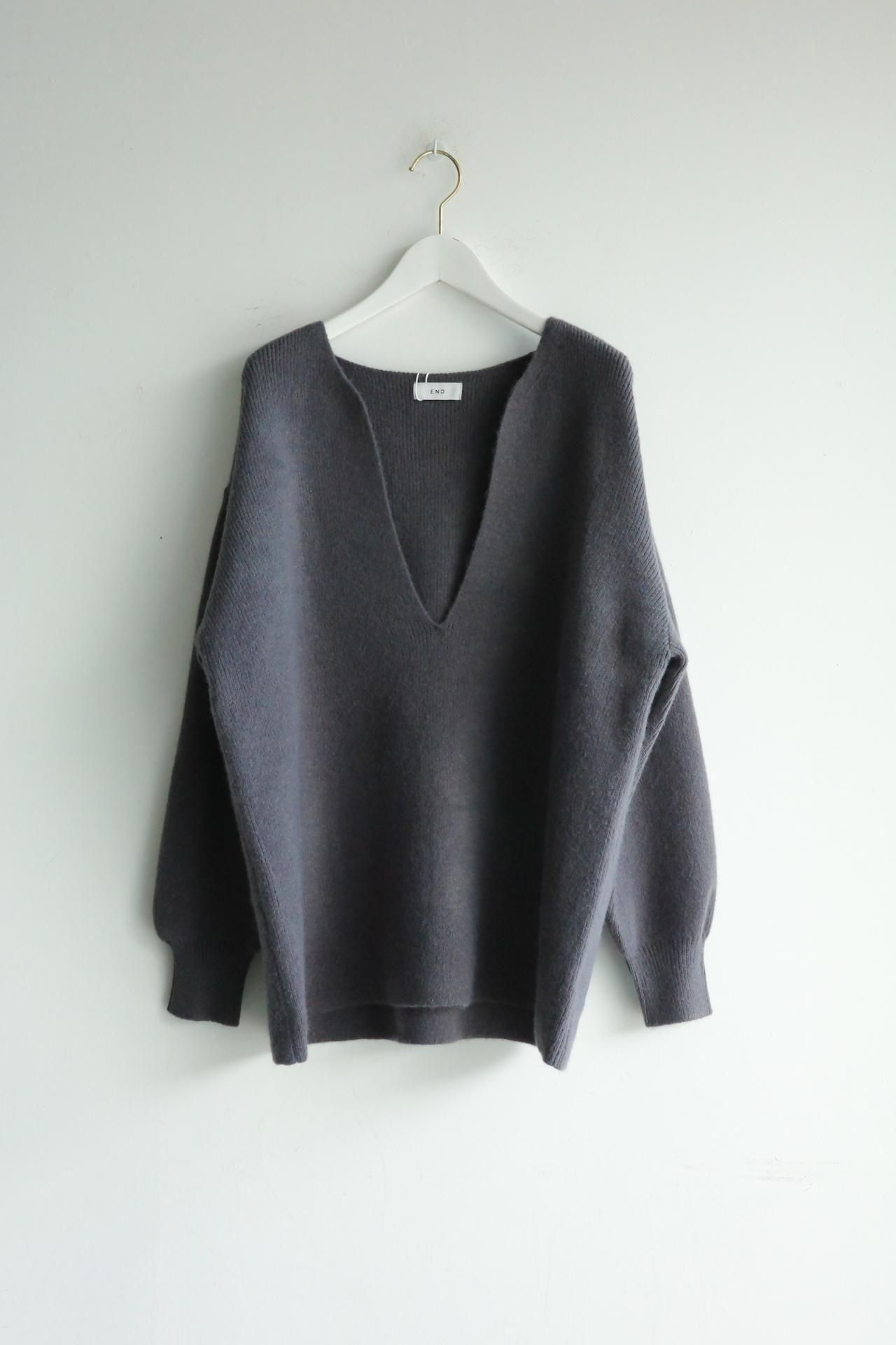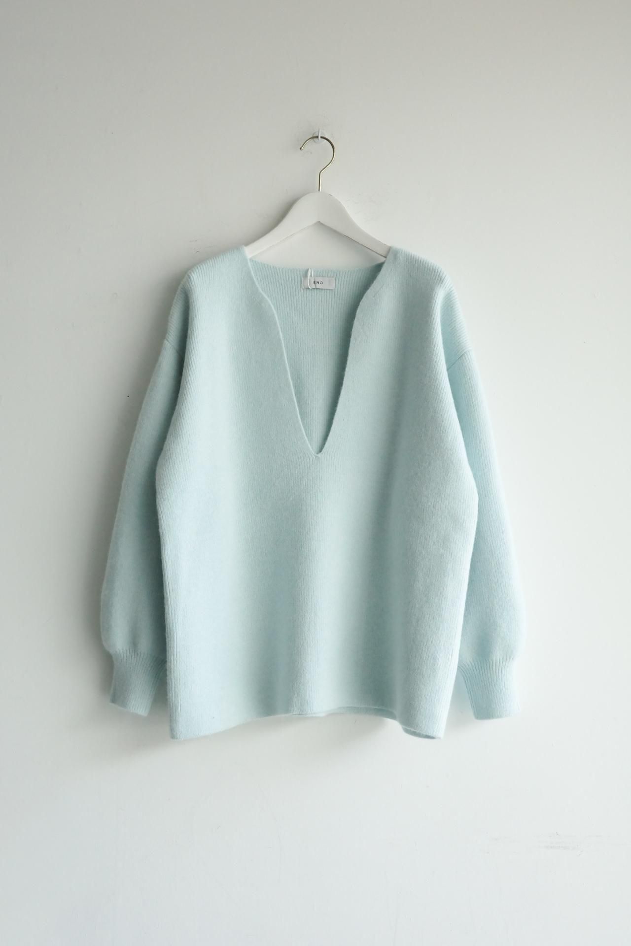 深めのVネックが顔まわりをすっきりと見せるデザインで